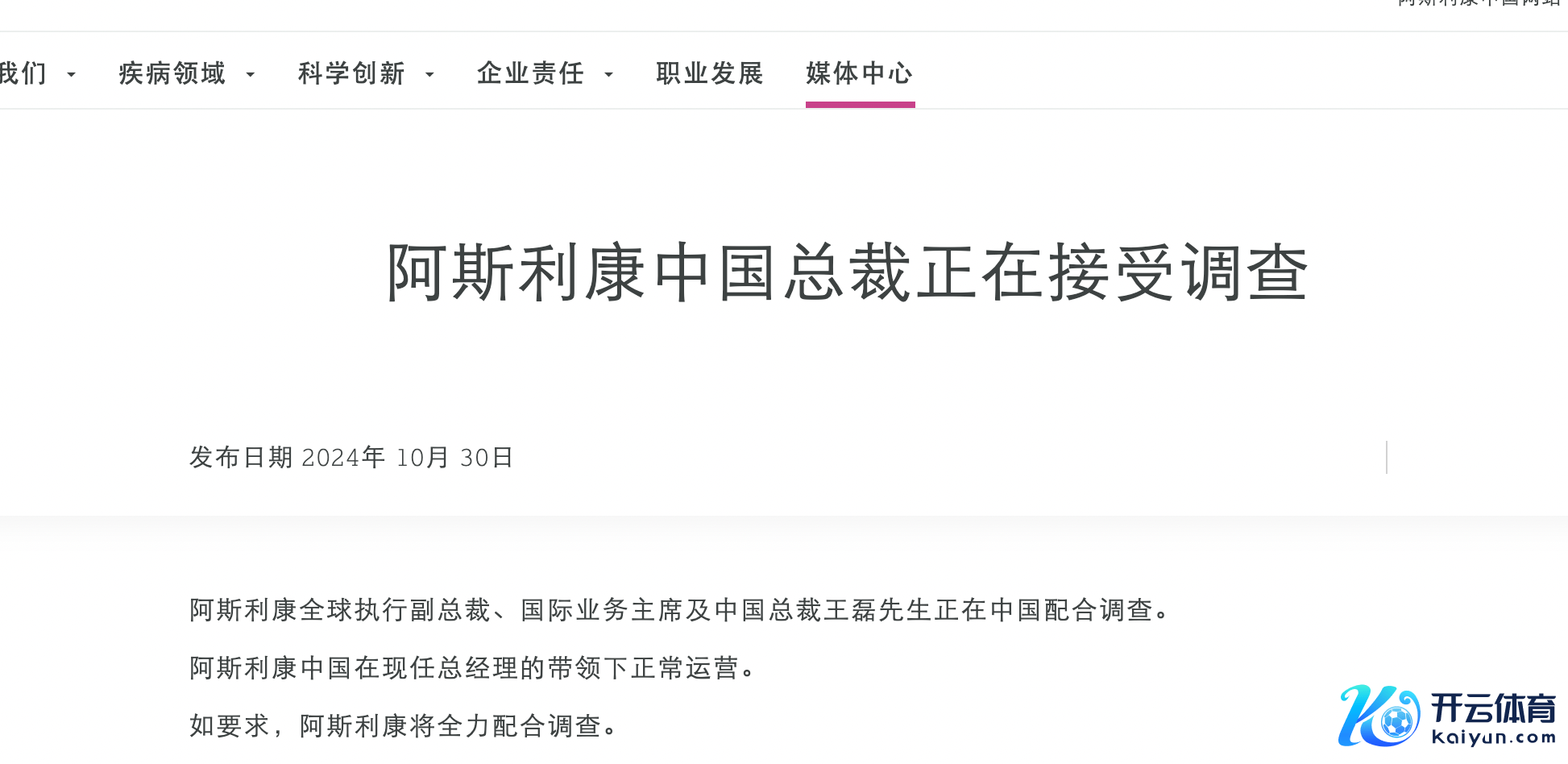 公告称,阿斯利康中国在现任总司理的携带下平素运营。如条款,阿斯利康将全力配合探望。