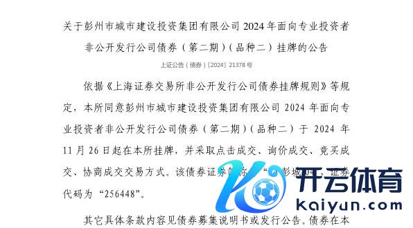 依据《上海证券交游所非公劝诱行公司债券挂牌功令》等限定万博manbext体育官网app娱乐,上交所高兴彭州市城市确立投资集团有限公司2024年面向专科投资者非公劝诱行公司债券(第二期)(品种二)于2024年11月26日起在上交所挂牌,并继承点击成交、询价成交、竞买成交、协商成交交游样子。该债券证券简称为“24彭城04”,证券代码为“256448”。