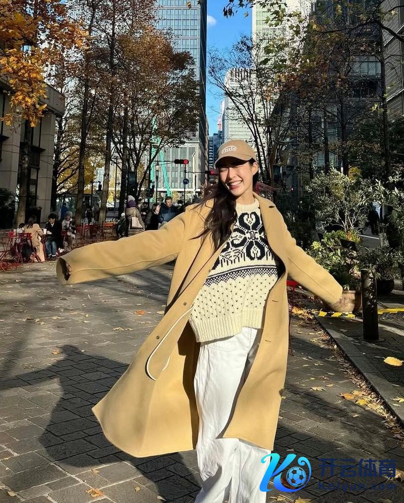 卡其色超长款羊绒大衣穿在邝玲玲身上尽然少许都不压身高,搭配米色守旧斑纹毛衣和白色恬逸长裤,十分崭新先锋的一套look。