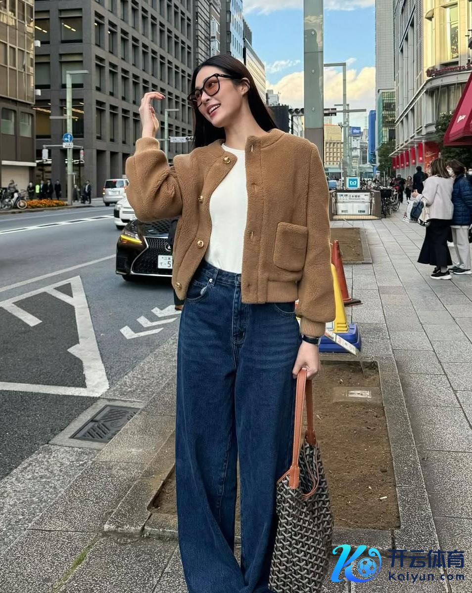 驼色毛绒外衣配上深色高腰牛仔裤,直筒的版型恬逸范王人备,配上一个棕色系托特包,超有旅群众的平安生存气味。