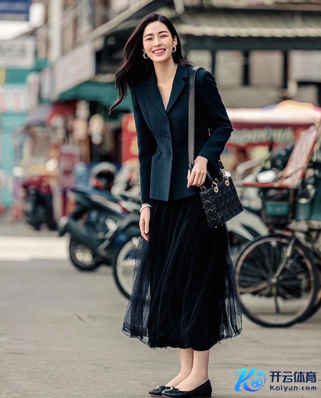 玄色修身剪裁的西服配上玄色半身纱裙,十分经典的一套Dior穿搭造型。优雅的玄色西服与玄色纱裙的碰撞,玄妙且知性,配上玄色戴妃包和玄色单鞋,把老钱风的先锋感发达出来了。