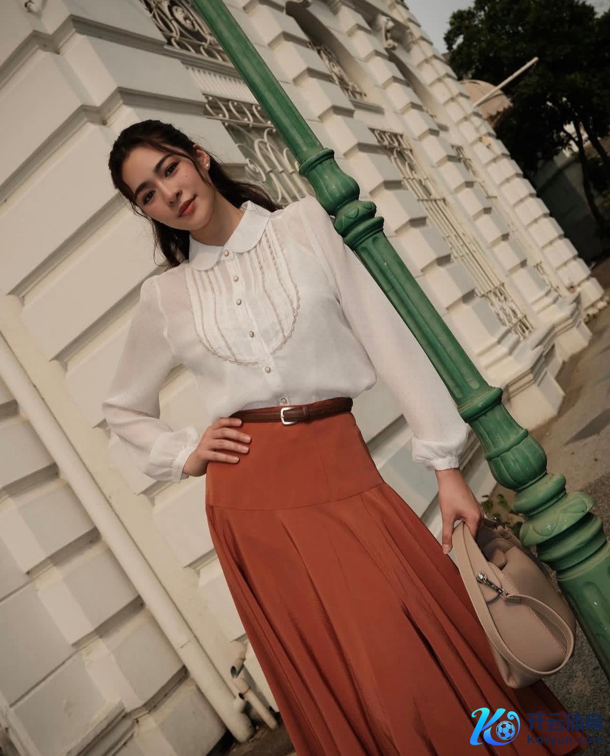 当作中泰混血的邝玲玲,自带港风女神buff,白色宫廷风蕾丝衬衫配上橘色百褶长裙,棕色腰带让体魄比例获取更好的展现,这一套穿搭尽显存眷与优雅。