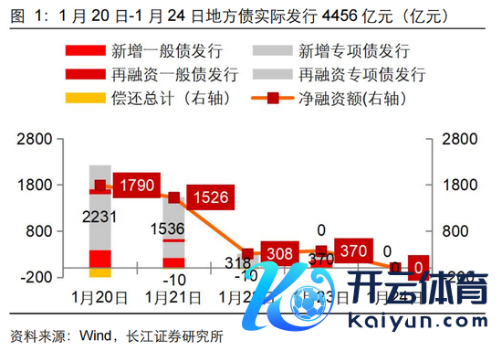 1月20日-1月24日地点债共刊行4456亿元。其中新增债2423亿元(新增一般债782亿元,新增专项债1641亿元),再融资债2032亿元(再融资一般债173亿元,再融资专项债1859亿元)