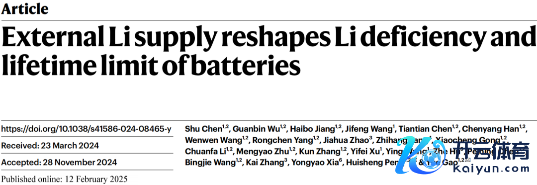 Shu Chen, Guanbin Wu, Haibo Jiang, Jifeng Wang, Tiantian Chen, Chenyang Han, Wenwen Wang, Rongchen Yang, Jiahua Zhao, Zhihang Tang, Xiaocheng Gong, Chuanfa Li, Mengyao Zhu, Kun Zhang, Yifei Xu, Ying Wang, Zhe Hu, Peining Chen, Bingjie Wang, Kai Zhang, Yongyao Xia, Huisheng Peng✉ & Yue Gao✉, External Li supply reshapes Li deficiency and lifetime limit of batteries, Nature, https://doi.org/10.1038/s41586-024-08465-y