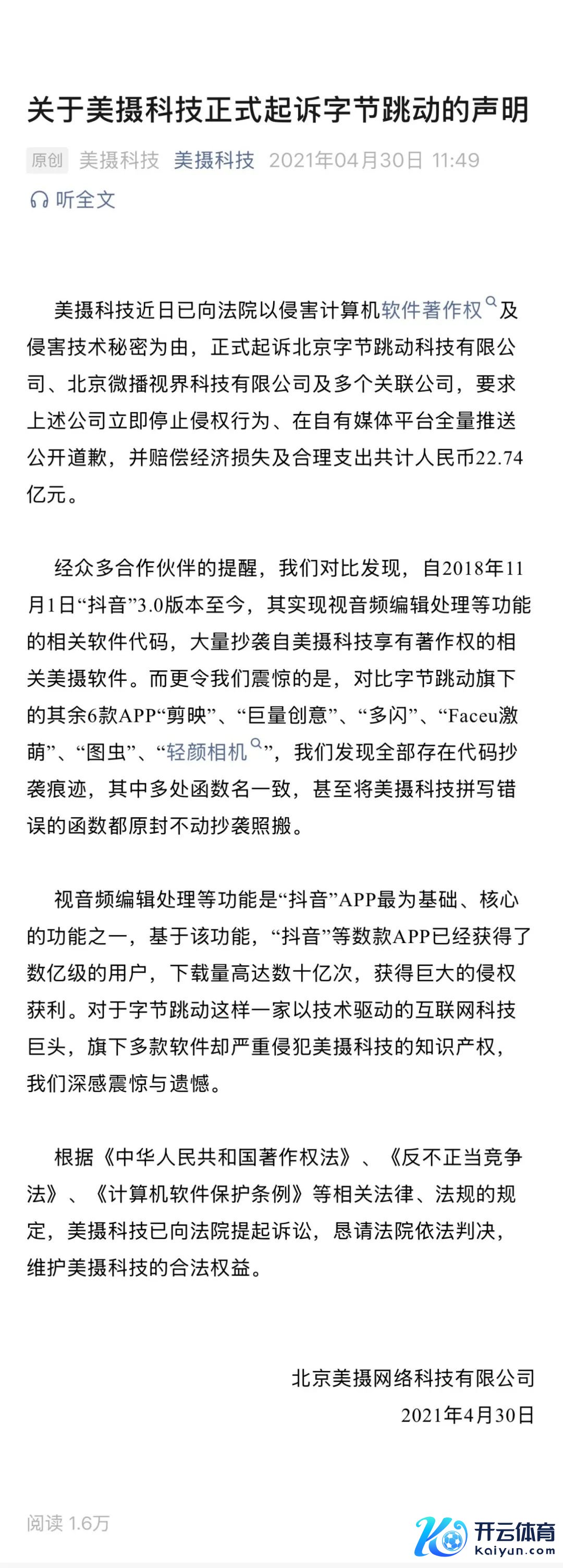 IT之家查询获悉,2021 年 4 月 30 日,好意思摄科技发布文章称,已向法院以侵害野心计软件文章权及侵害技艺奥密为由,认真告状北京字节跳跃科技有限公司、北京微播视界科技有限公司及多个关联公司,条目上述公司立即罢手侵权作为、在自有媒体平台全量推送公开说念歉,并补偿经济赔本及合理支拨系数东说念主民币 22.74 亿元。