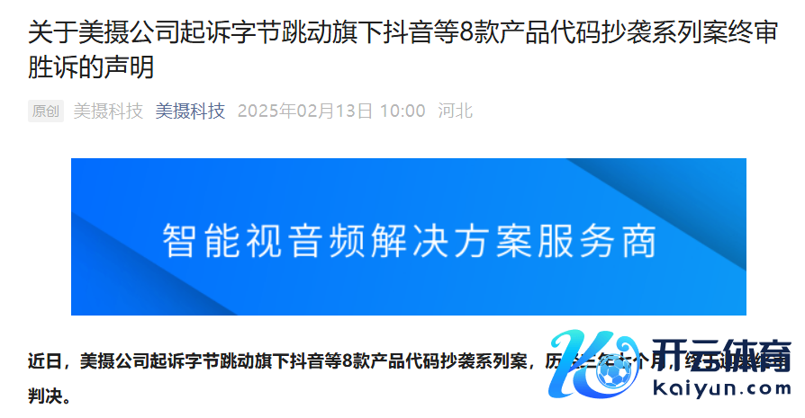 2021 年 5 月,好意思摄公司发现抖音软件的音视频剪辑科罚等关联功能代码大王人抄袭好意思摄公司享有文章权的好意思摄 SDK 软件,经进一步比对分析,好意思摄公司发现同属于字节跳跃旗下的剪映、巨量创意、Faceu 激萌、图虫、轻颜相机、多闪、火山引擎 VESDK 等家具也存在软件代码抄袭。好意思摄公司以侵害野心计软件文章权为由,就上述 8 款涉嫌侵权软件家具,永别向北京常识产权法院、北京市高等东说念主民法院拿告状讼,同期也向北京市高等东说念主民法院就抖音公司及某职工拿起侵害技艺奥密诉讼。